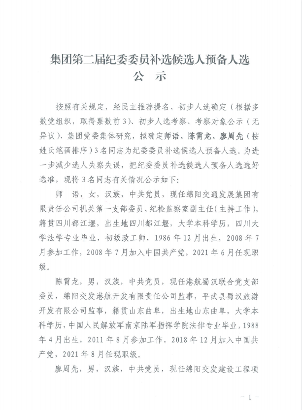 中拱綿陽交通發(fā)展集團有限責(zé)任公司委員會<關(guān)于進行集團第二屆紀(jì)委委員補選候選人預(yù)備人選公示的通知>
