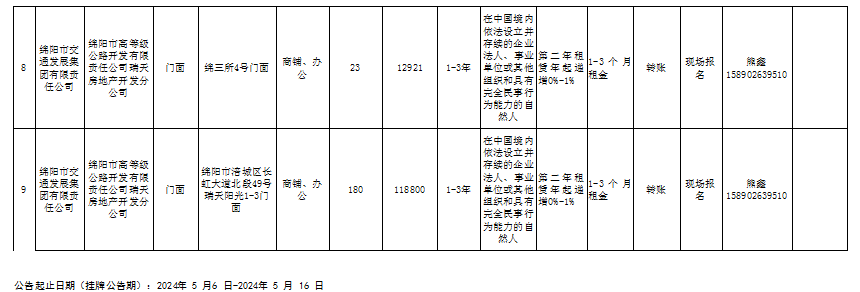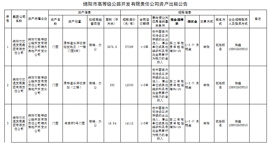 綿陽(yáng)市高等級(jí)公路開發(fā)有限責(zé)任公司資產(chǎn)出租公告